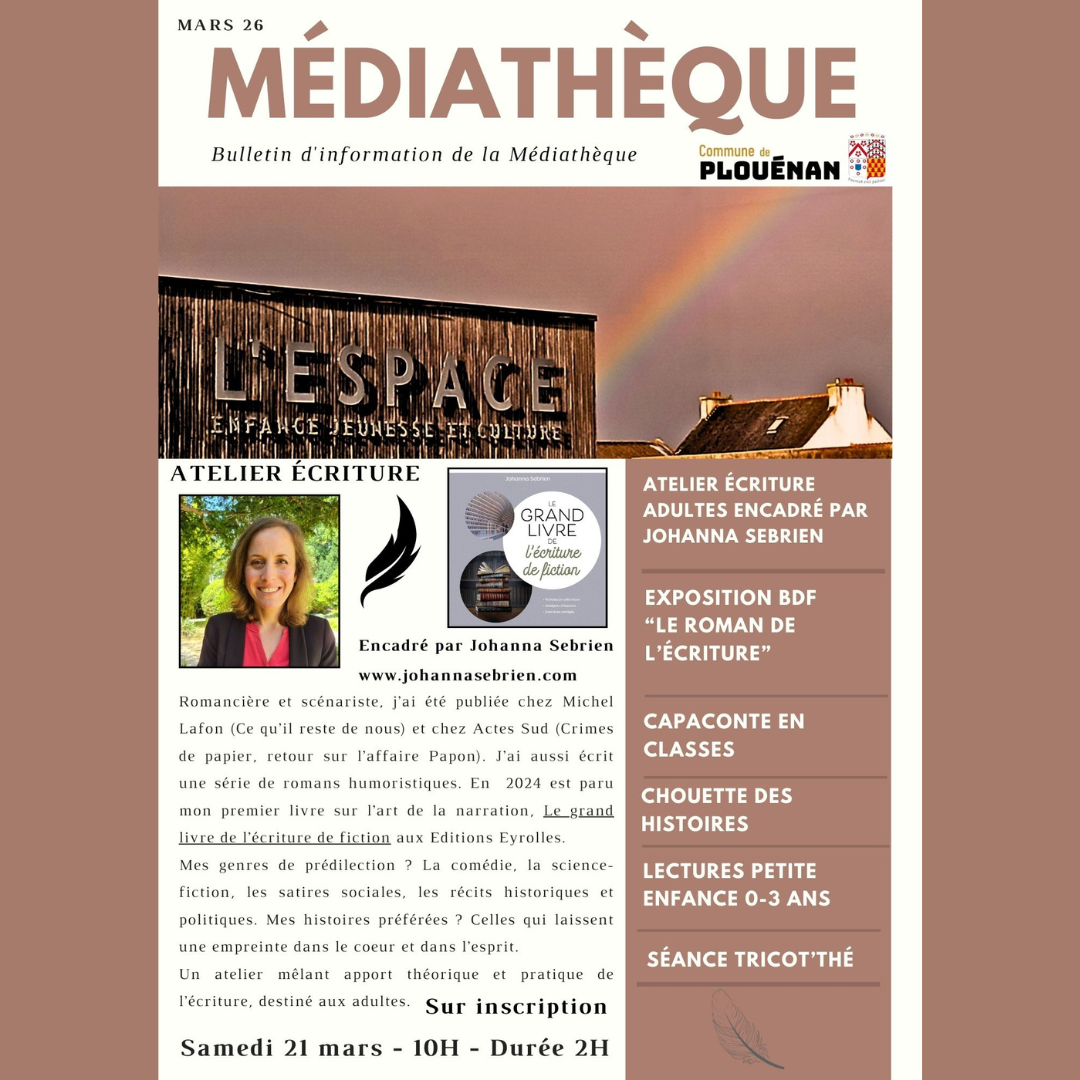 Le 21 mars prochain, j’animerai un atelier d’écriture à la médiathèque de Plouénan, dans le Finistère. Bientôt plus d’infos sur cette page d’accueil !